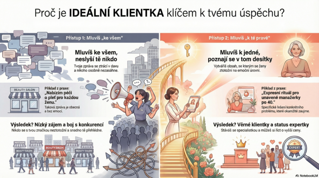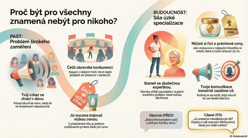 Klientky dnes nehledají univerzální řešení, ale chtějí nakupovat od někoho, kdo je expertem na jejich konkrétní problém. Právě úzká specializace v tobě buduje autoritu a důvěru. Pokud cílíš na všechny, neprodáš nikomu, ale pokud zacílíš na konkrétní skupinu, staneš se pro ni jedinou logickou volbou.