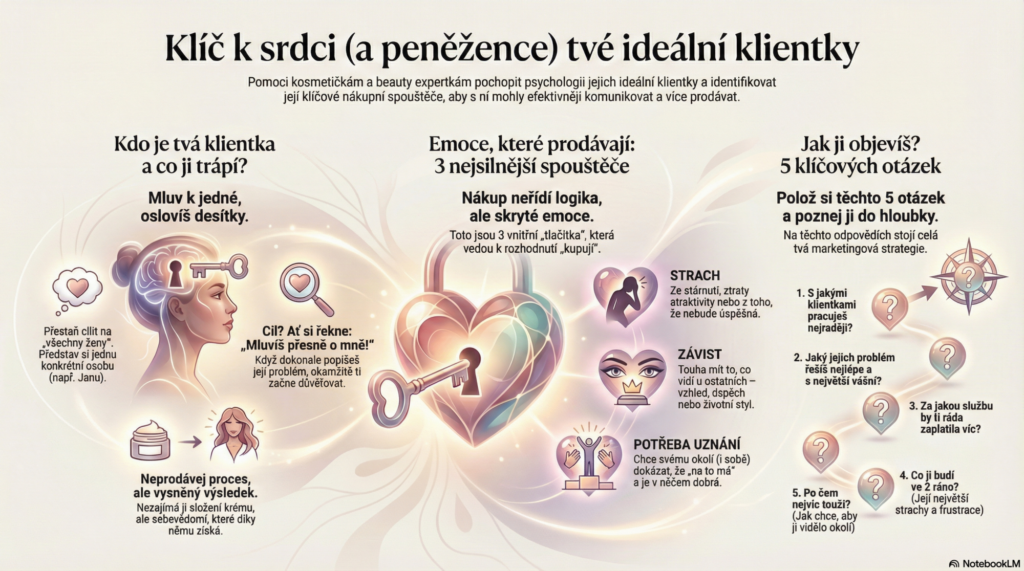 Definování ideální klientky navíc neznamená odmítat ostatní. Znamená to, že víš, pro koho primárně tvoříš svůj obsah a služby, a dokážeš s ní mluvit jazykem, který ji zasáhne přímo do srdce.