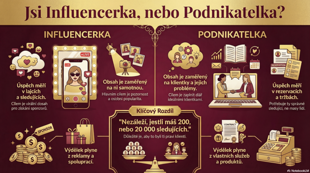 V tomto článku se dozvíš, proč tvé krásné fotky na Instagramu nepřinášejí skutečné rezervace a jak tento problém vyřešit. Vysvětlím zásadní rozdíl mezi strategií influencerky (která sbírá lajky) a podnikatelky (která plní diář). Představím ti 3-krokový systém, který promění tvé sledující v platící klientky, a provedu tě obsahovou cestou, která vede ženy od bezcílného scrollování až k rezervaci termínu.