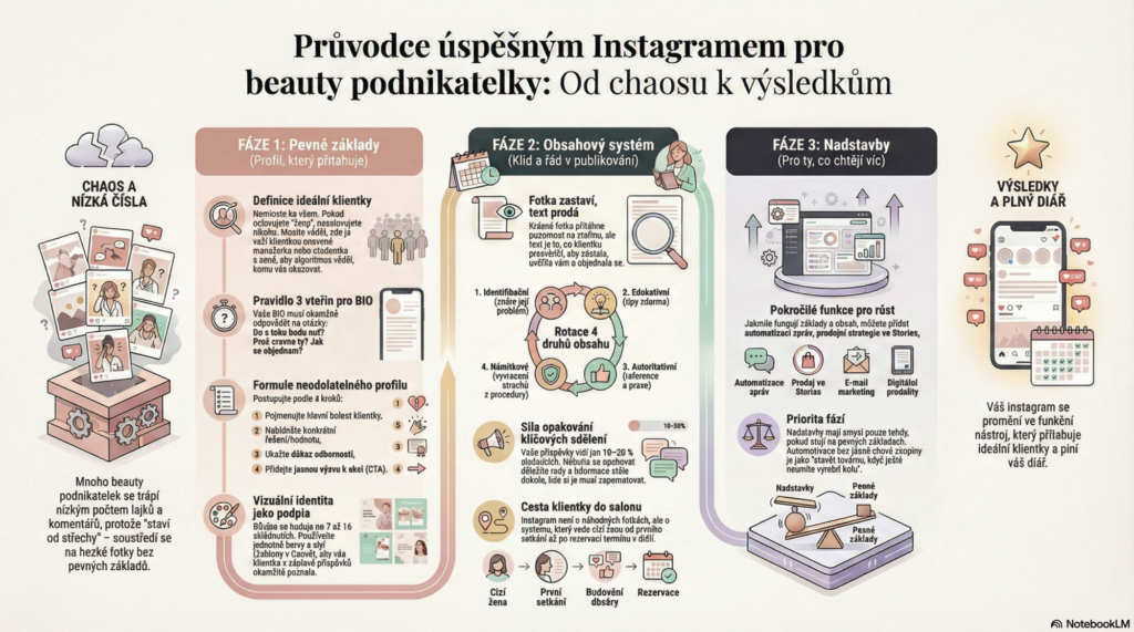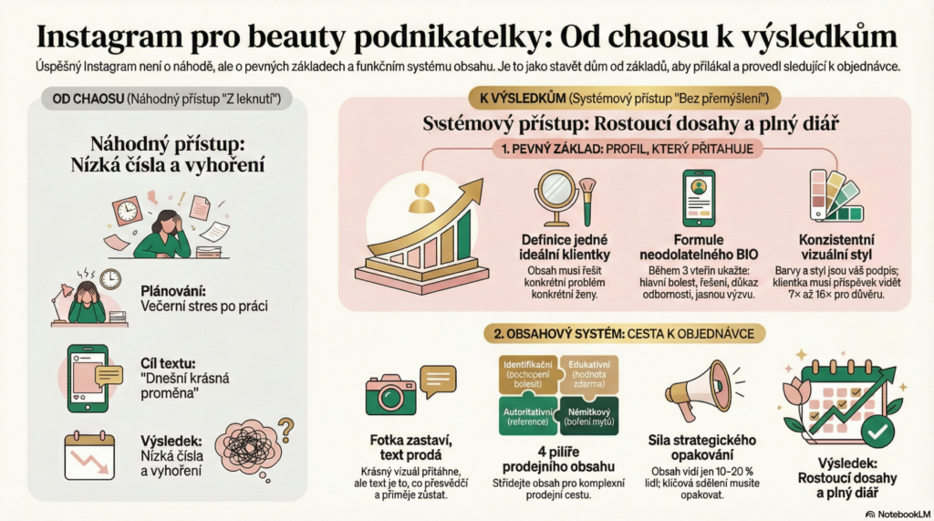 V tomto článku se dozvíš, proč krásné fotky nestačí a co ve skutečnosti přivádí klientky, které konkrétní části musíš mít nastavené správně, aby Instagram fungoval, proč texty prodávají víc než fotky, jak provést klientku od prvního setkání po rezervaci a jak vytvořit strukturu, která ti přináší objednávky (ne jen lajky).