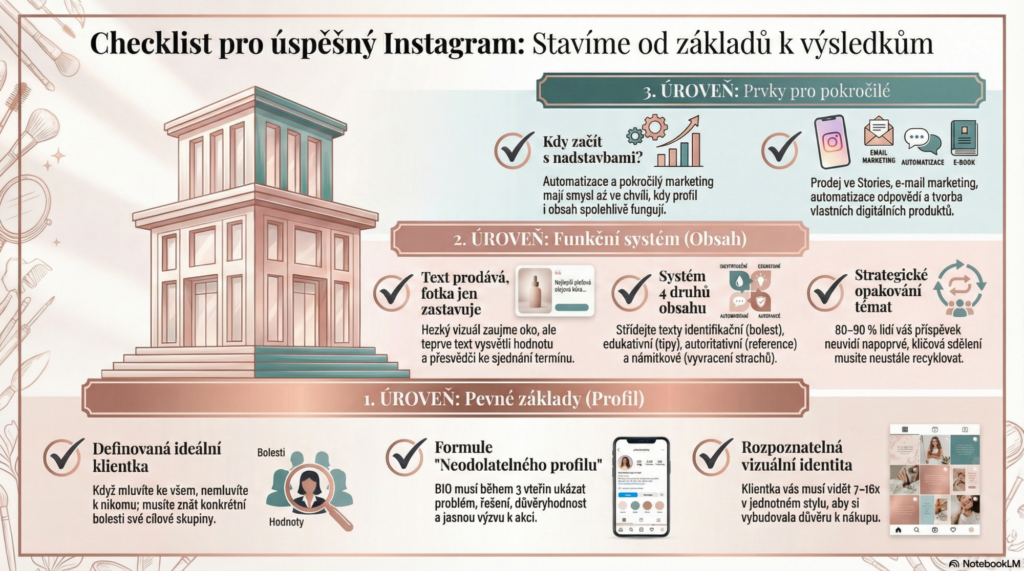 Dobře, máš profil v pořádku. Máš jasnou ideální klientku, BIO, které funguje, vizuální identitu, která buduje důvěru. A teď co? Teď potřebuješ obsah. Ale ne ledajaký obsah. Potřebuješ SYSTÉM.